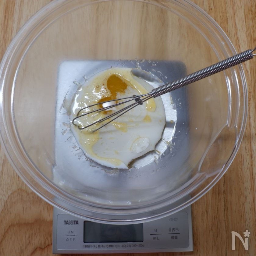 (2) 太白胡麻油、牛乳の順番にボールに入れ混ぜ合わせていく。