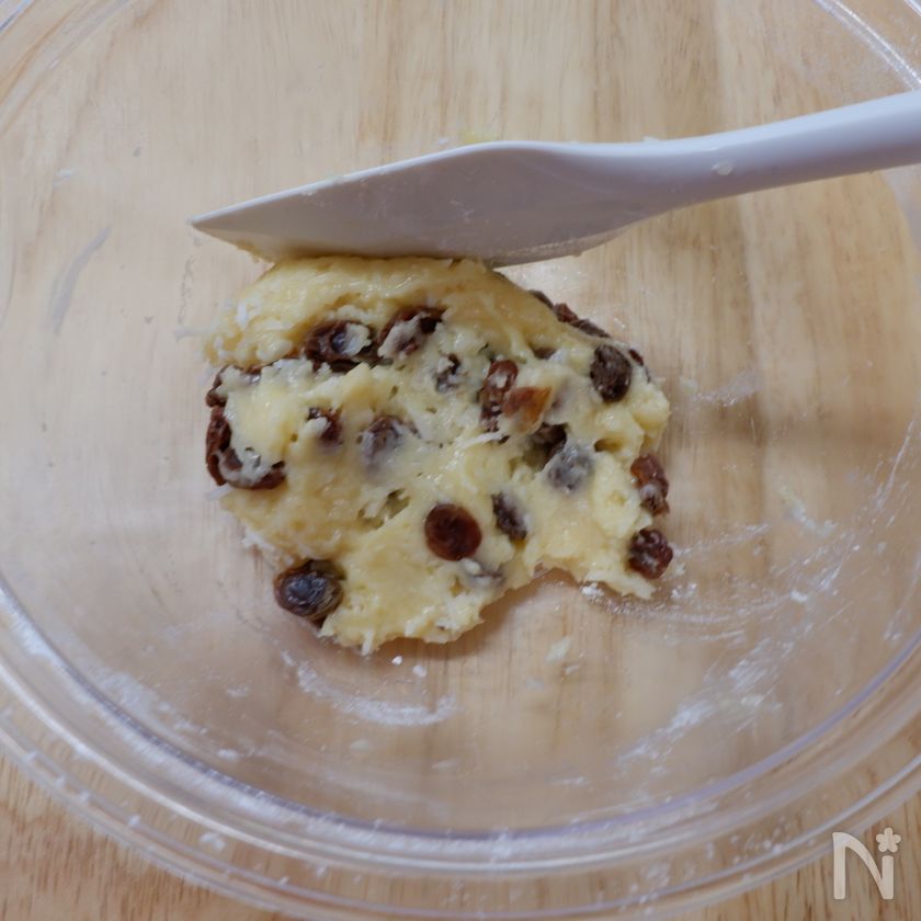 (4) ある程度粉気がなくなった段階でレーズンとココナッツロングを入れて完全に粉気がなくなるまで混ぜる。