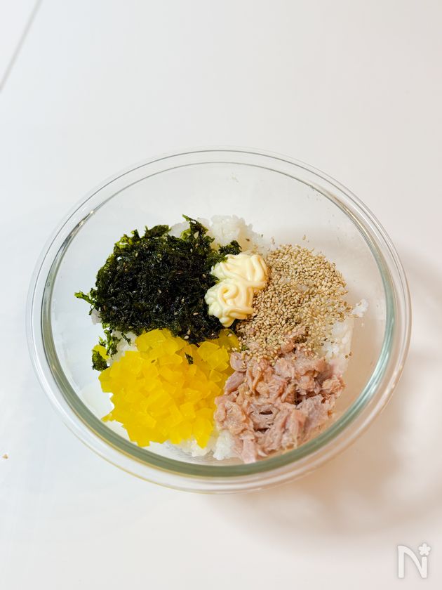 (1) ご飯にツナ缶、たくあん、韓国のり、白いりごま、マヨネーズ、醤油を加えて混ぜる。