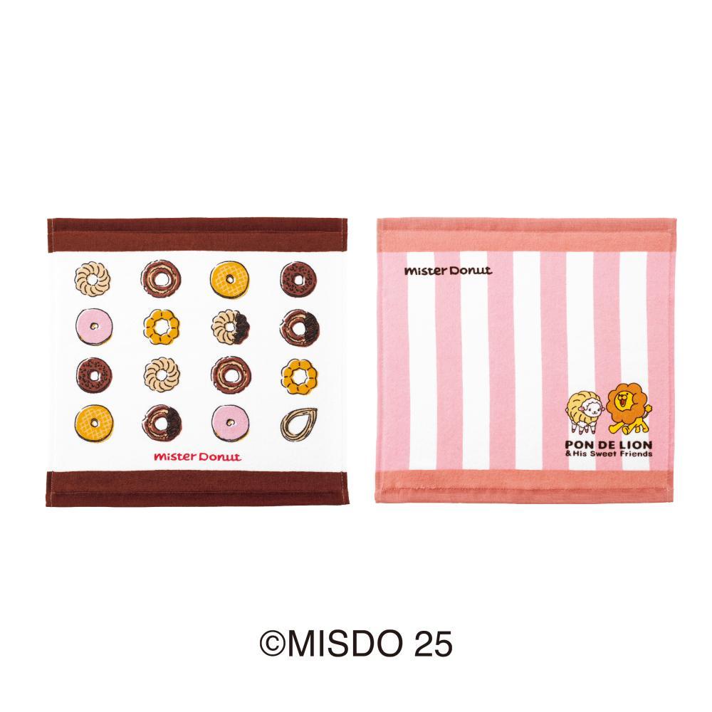 ポン・デ・ライオンとフレンチウーラーが描かれたストライプ柄と、人気のドーナツがデザインされたドーナツ柄の2枚セットです。素材は綿100%で、サイズは縦約30センチ×横約30センチ。