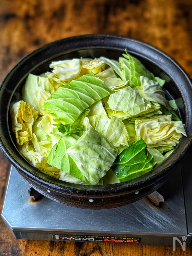 (3) キャベツをふんわりと加え、中火で加熱する。フタをして沸騰させる。