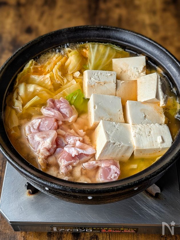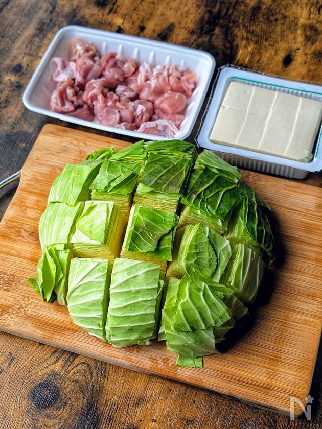 (1) キャベツはひと口大のざく切りにする。鶏もも肉はひと口大に切る。木綿豆腐は8等分に切る。
