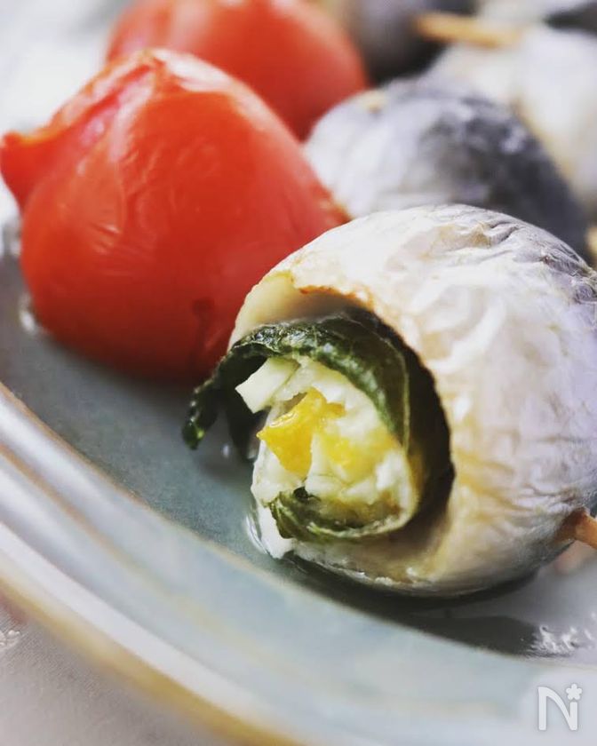 (1) 半分にしたいわしは尾を向こう側におき、塩レモンをのせて、クルクルと巻き、爪楊枝を刺す。ミニトマトにも爪楊枝を刺す。