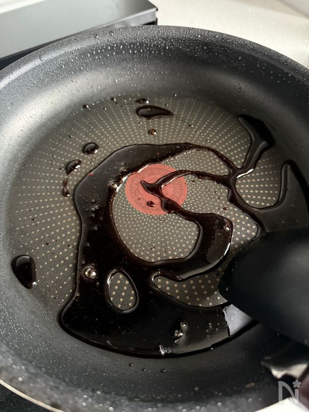(6) フライパンの汚れを拭き取ったら、【A】を入れて弱めの中火で1分ほど煮立てせる。
