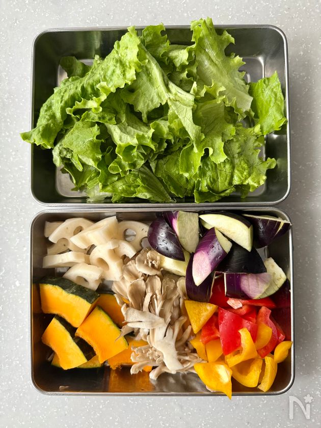 舞茸は食べやすい大きさにほぐし、赤パプリカ、黄パプリカは乱切りにし、リーフレタスは食べやすい大きさにちぎる。