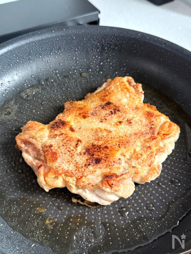 (3) フライパンにサラダ油小さじ1(分量外)を入れ中火で熱し、鶏肉の皮目を下にしてフライ返しで押さえながら6分焼く。