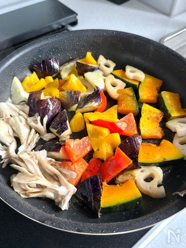 (5) 4と同じフライパンに野菜を入れ、塩こしょう少々(分量外)を加え、全体に焼き色がつくまで焼いたら取り出す。