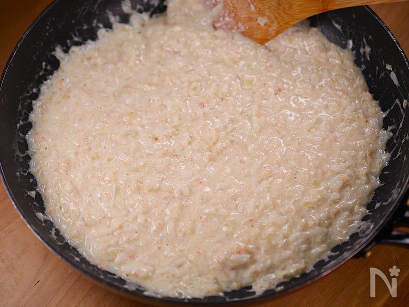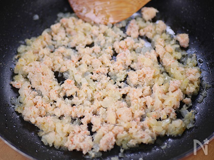 (1) フライパンにサラダ油(大さじ1、分量外)、有塩バター(15g)、玉ねぎ(みじん切り)を加え、飴色になるまでじっくり炒めたら、カニ缶(汁を切る)を加え炒め合わせる。