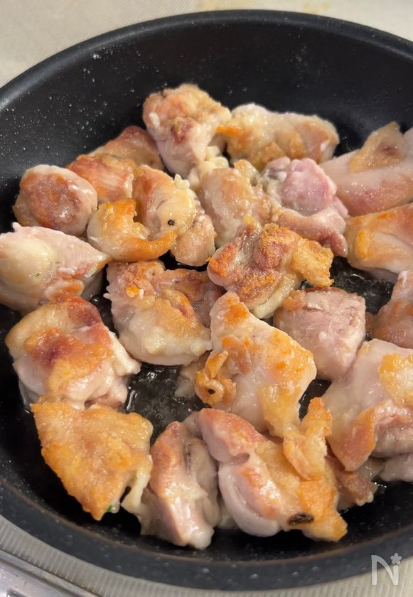 鶏もも肉は米粉をまぶして焼くことで、外はカリッと中はジューシーに仕上がり、
