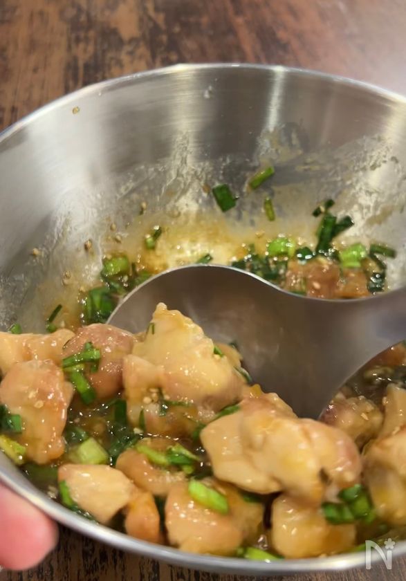 香りのいいにらダレを絡めた、ご飯が止まらないガッツリ系チキン。