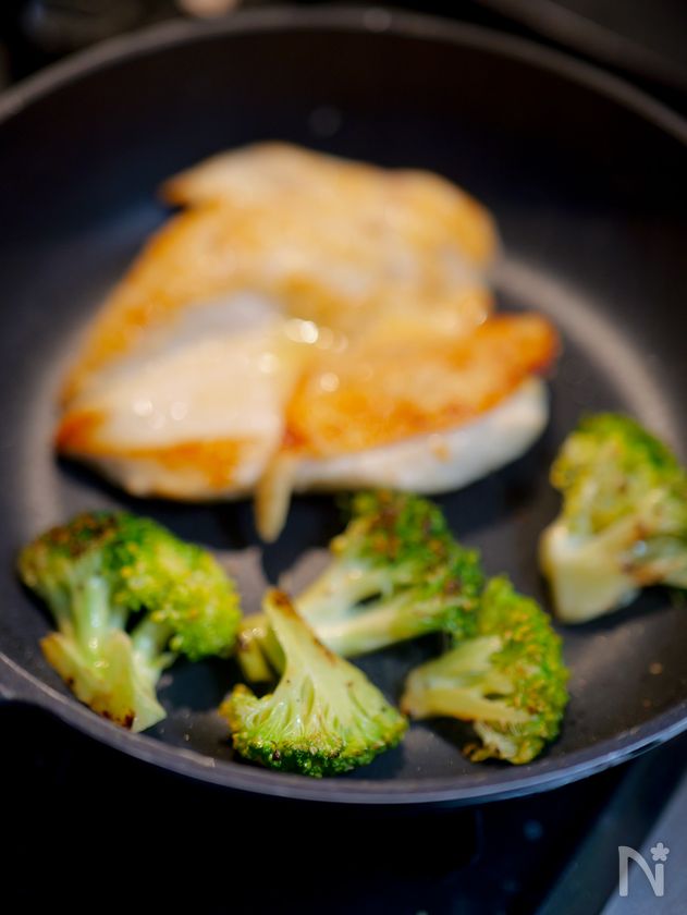 (4) 皿にブロッコリー、鶏むね肉を取り出し、【B】を加えてふつふつと煮立ったら肉を戻し絡めるようにして焼く。