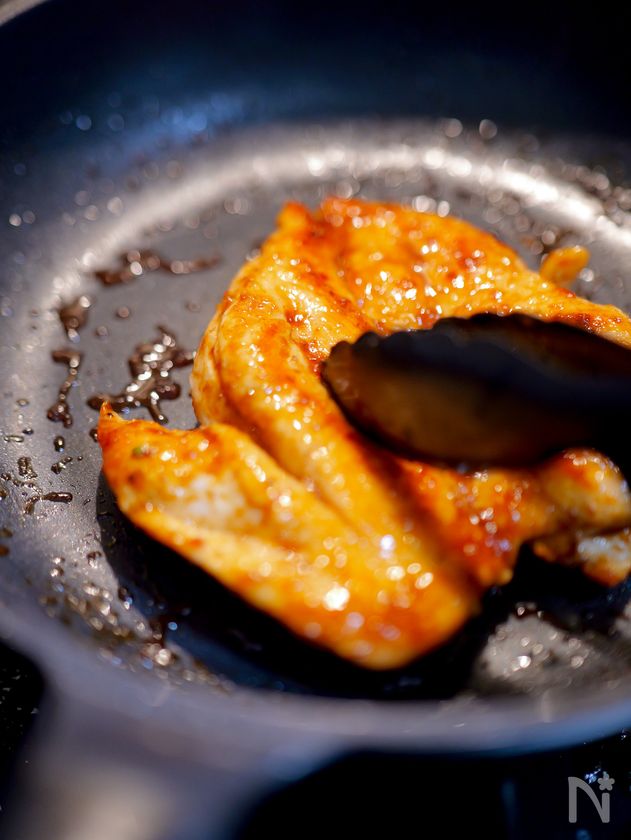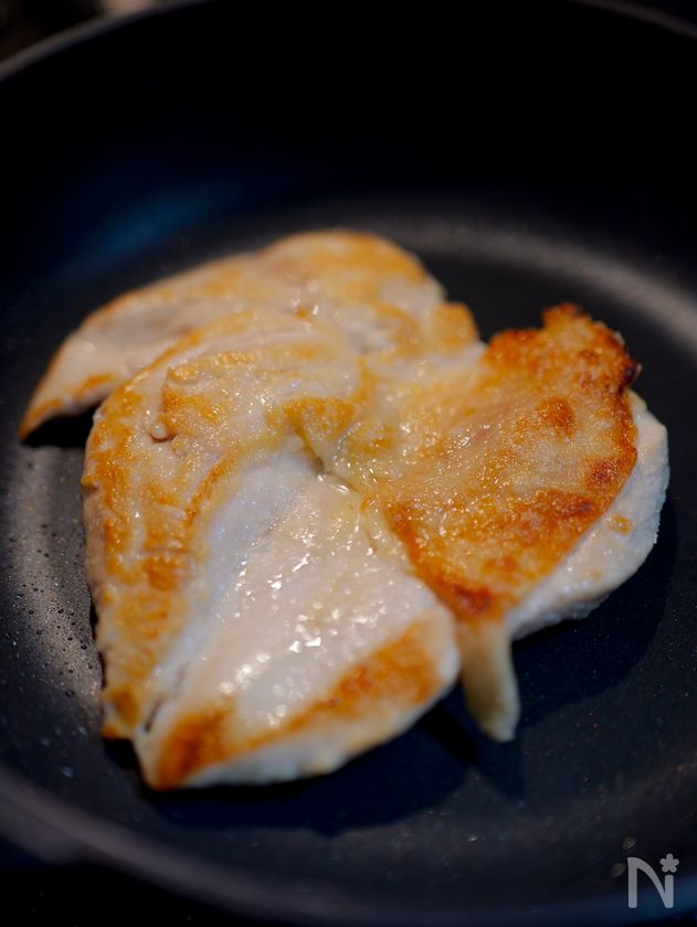 鶏むね肉の片栗粉は薄めに。皮を外さない代わりに少量の油で焼いています。(油はオイルスプレーなどを活用するといいですね!)