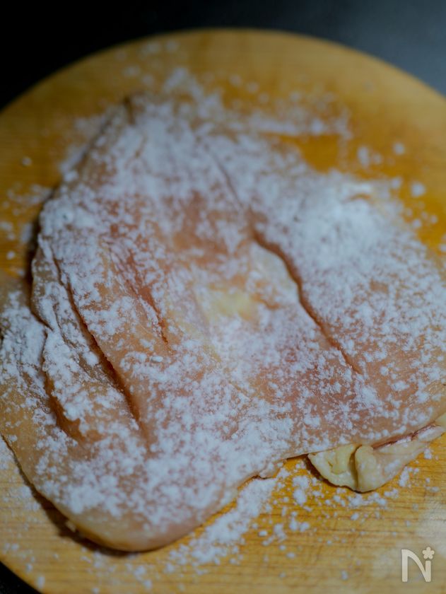 (1) 鶏むね肉を厚みが均一になるよう開き、塩を揉みこむ。片栗粉を全体に薄くまぶす。