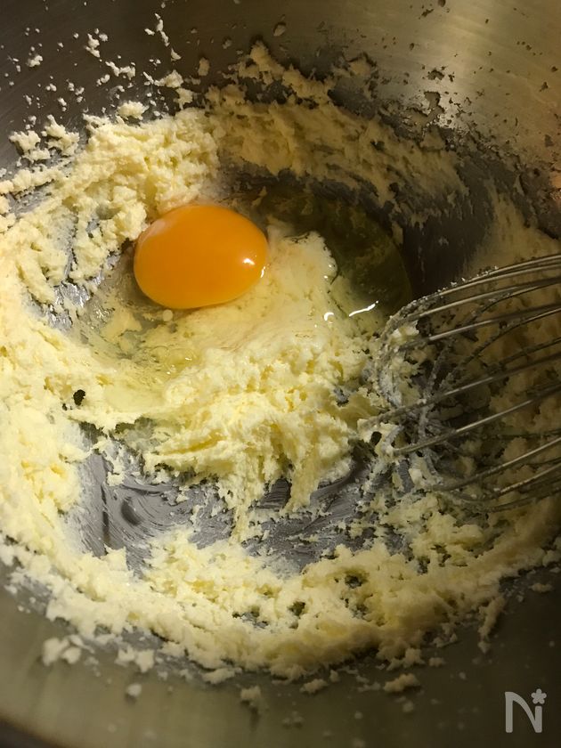 (1) バターはハンドミキサーで混ぜます。白っぽくなったらグラニュー糖を入れて更に混ぜます。玉子を入れて混ぜます。溶いた卵を少しずつ入れる方が分離しにくいです。