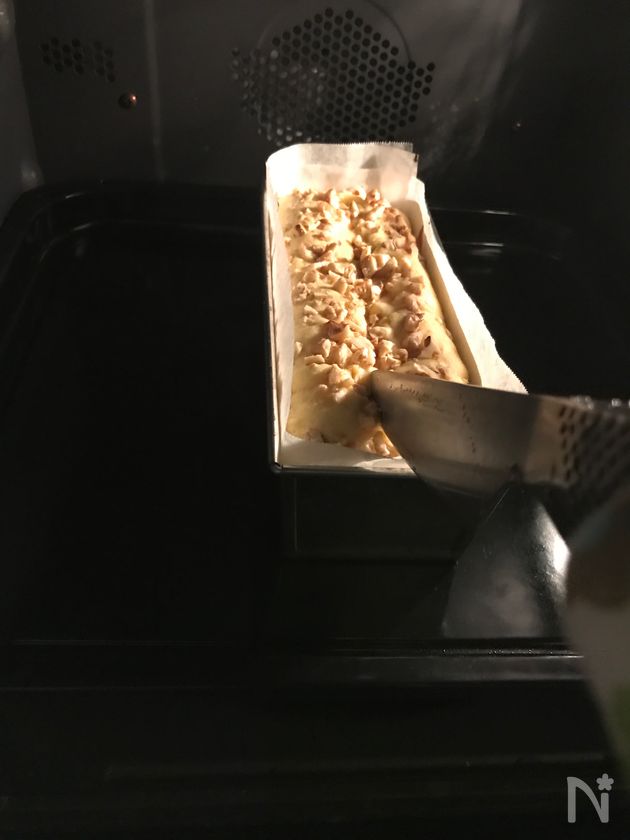(4) フォークでつぶしたバナナを入れて混ぜ合わせ、クッキングシートを敷いたパウンド型に入れて焼きます。
