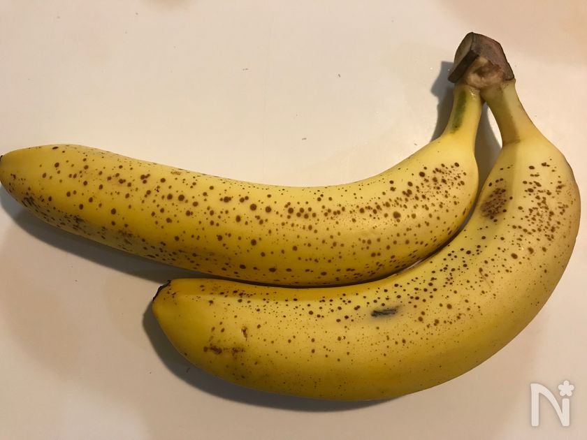(2) バナナはシュガースポットが出た完熟のバナナを使うと美味しくできます。薄力粉とベーキングパウダーはあわせてふるいます。