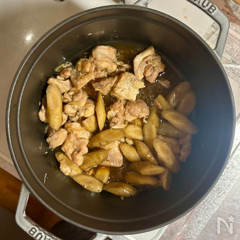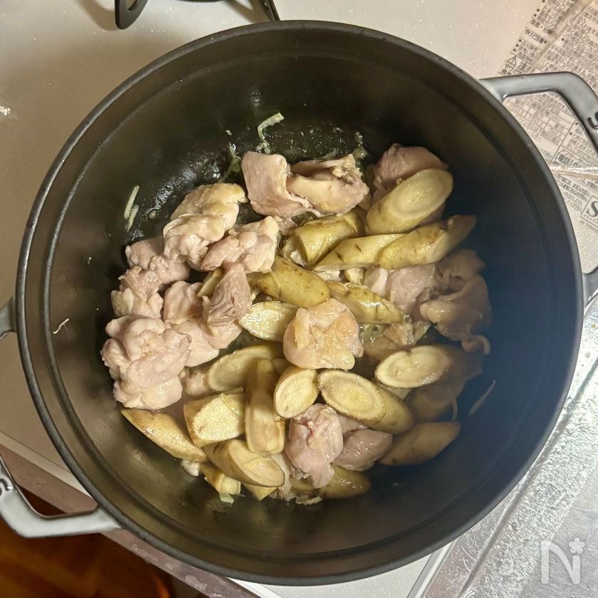 (4) 鶏肉を裏返してごぼう、しょうがを加え、鶏肉から出た脂をごぼうにからめながら1分ほど炒める。