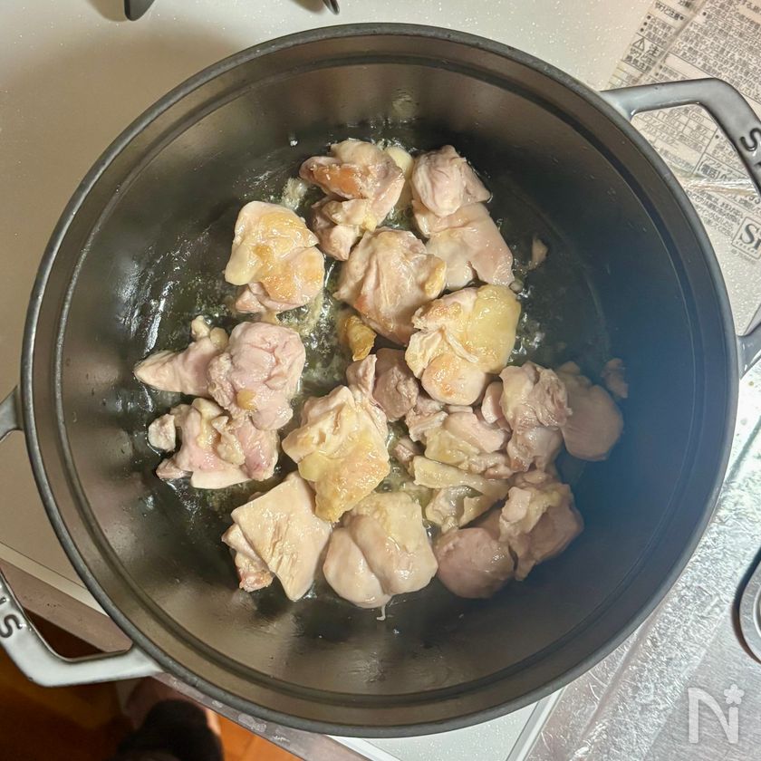 鍋が温まったら鶏肉の皮目にこんがりと焼き色がつくまで5分ほど焼く。