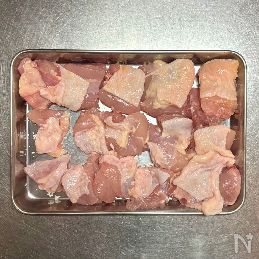 (1) 鶏もも肉は余分な脂肪と筋を除いて4cm大に切り、身側に塩をふる。