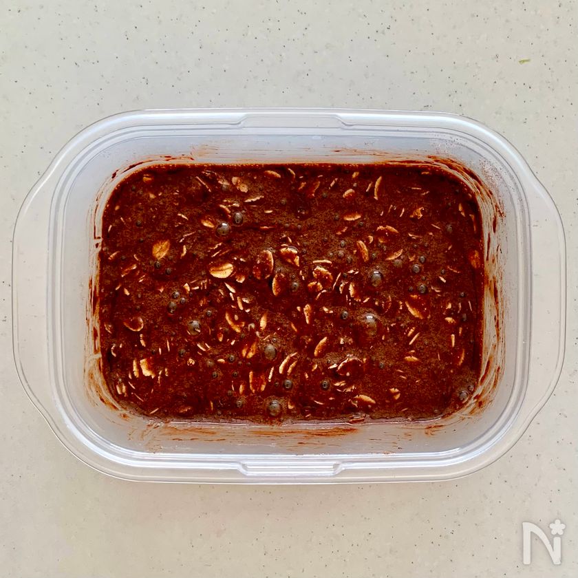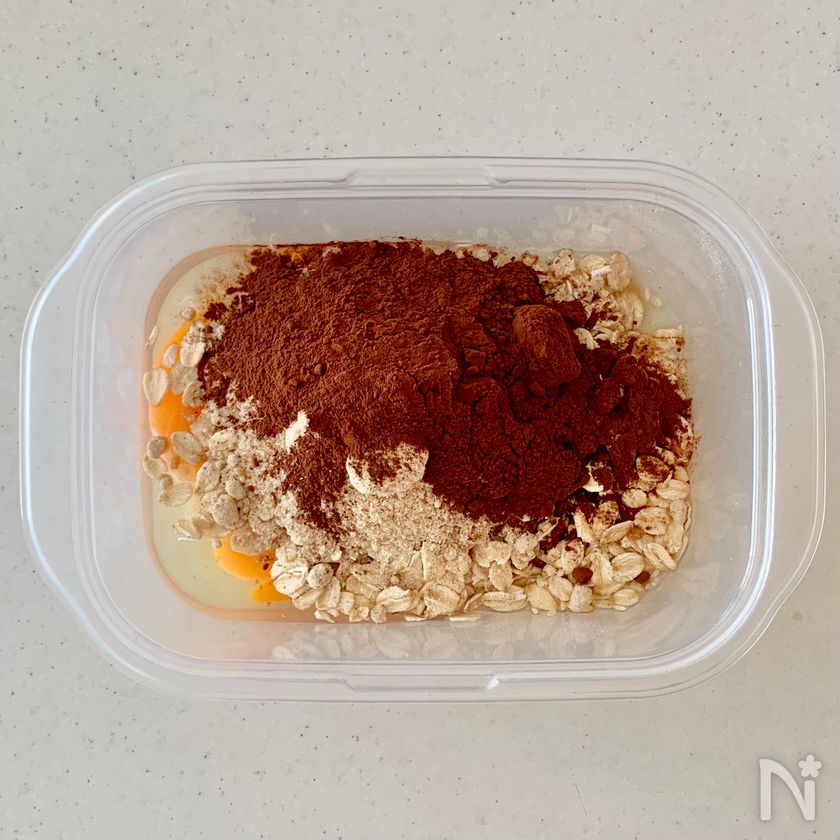 (1) タッパーまたは耐熱皿に卵・オートミール・ココア・砂糖をすべて入れる。