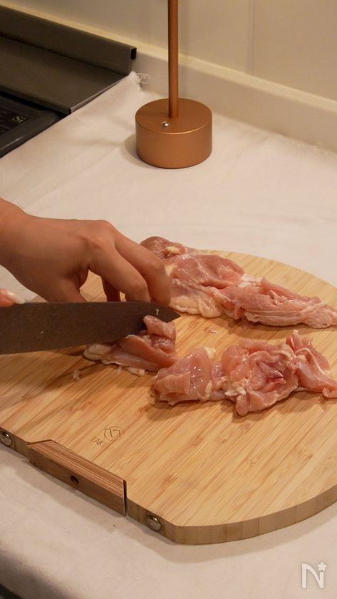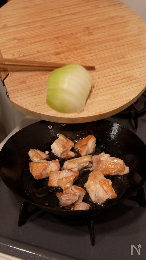 (下準備) まず鶏もも肉 を一口大にカットし、玉ねぎは少し大きめに切る。