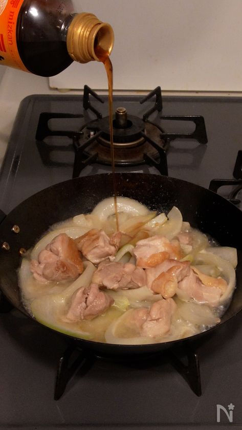 (2) 玉ねぎがしんなりしてきたら、水 と濃縮めんつゆ を加えて強火で煮立たせる。