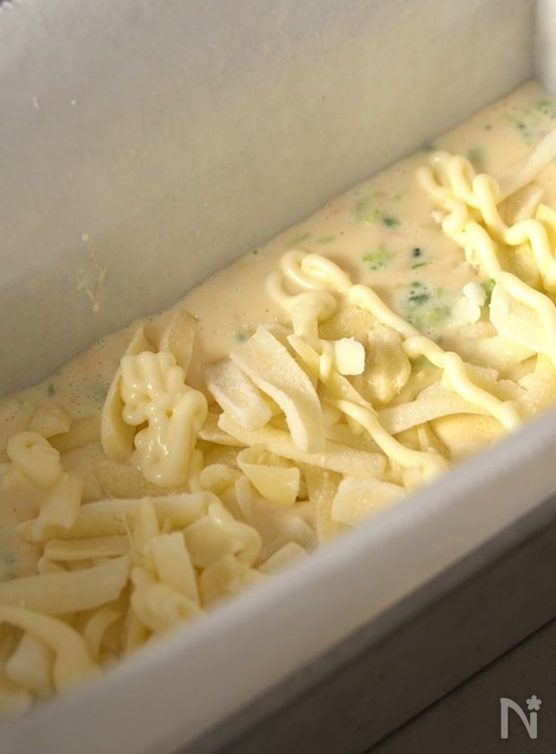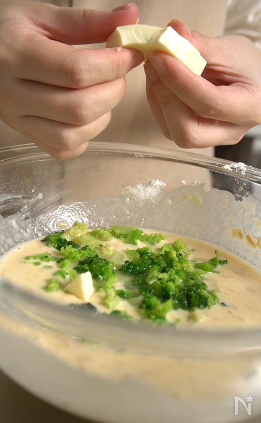 (2) ブロッコリー、プロセスチーズを細かく切って加えたらベーキングパウダーを加えてざっくり混ぜる。