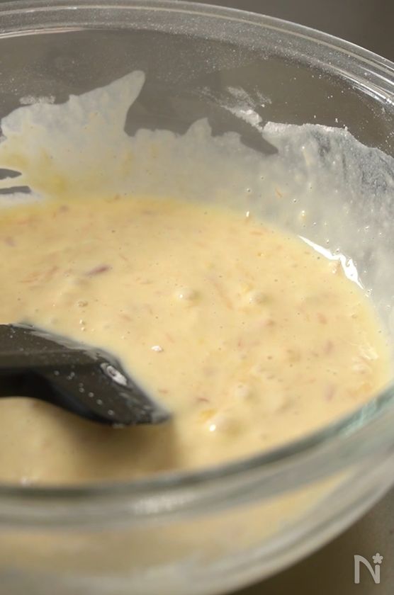 (1) 卵、ツナオイル缶をオイルごと、砂糖を加えてよく混ぜたら米粉、マヨネーズ、無調整豆乳を加えてよく混ぜる。