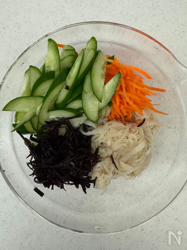 (1) きゅうりと人参は、塩小さじ1/2で、塩もみし、すすいで絞り、ひじきと、切り干し大根と一緒にボウルに入れる。