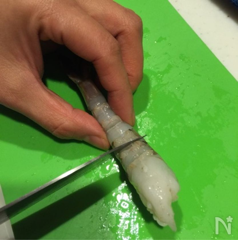 (1) 海老の腹の方に浅く切り込みを数カ所入れる。