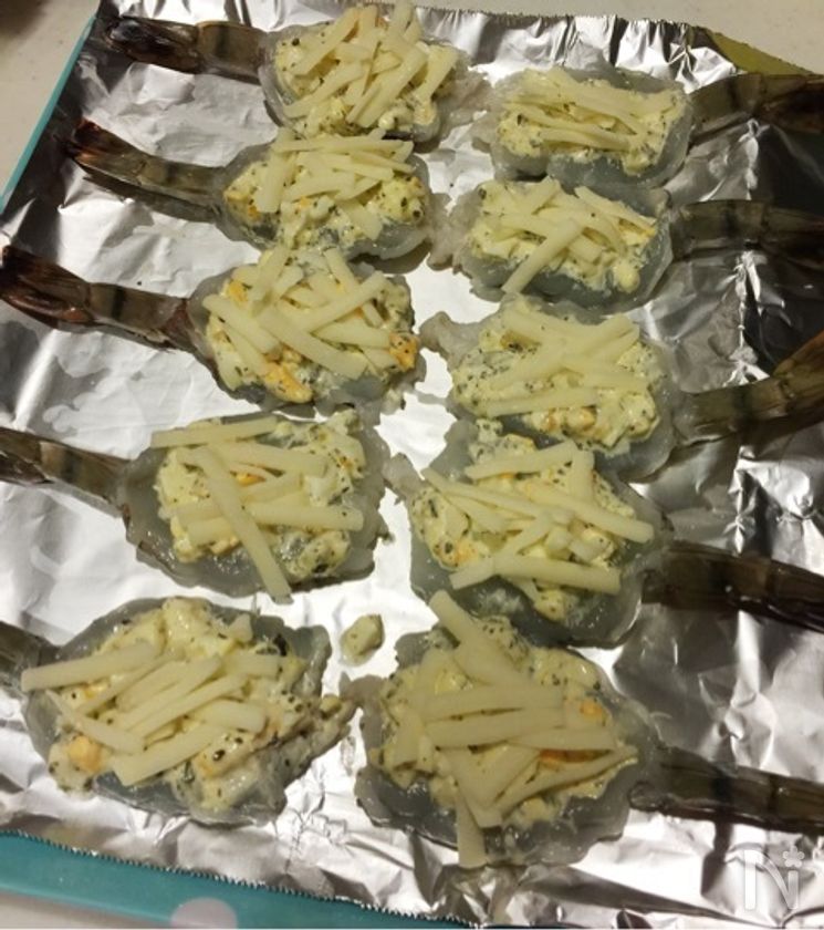 (4) 開いた海老の上に3を盛り、ピザ用チーズを上から乗せる。