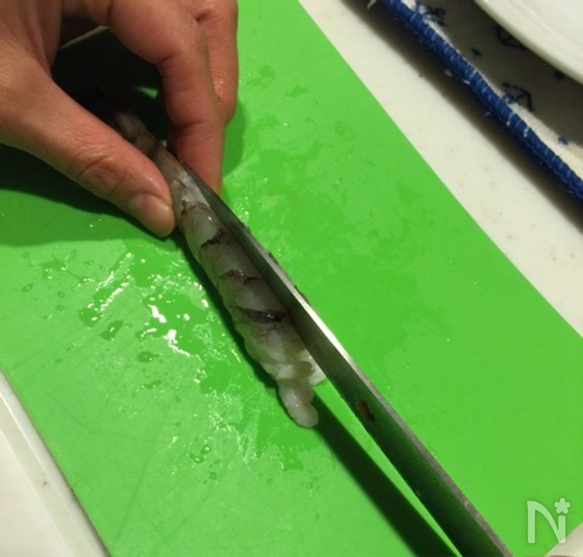 (下準備) 背わたを取り、【A】の調味料で揉みこんだらよく水洗いをする。