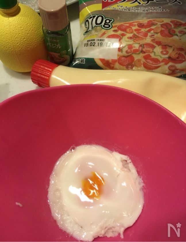 (3) 耐熱容器に卵を割り入れ、黄身に数カ所穴を開けたらレンジ600wで1~2分加熱し泡立て器で潰した【B】の調味料も入れて混ぜる。
