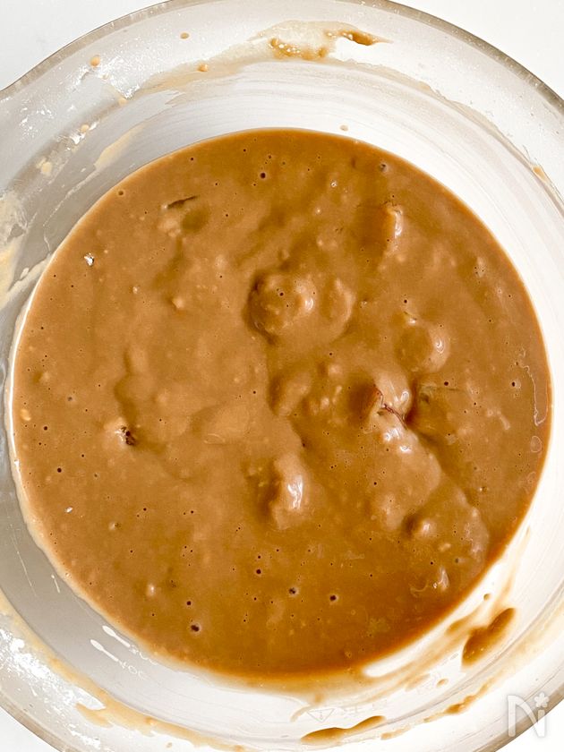 (4) 薄力粉、ベーキングパウダーを合わせてふるい入れ、ゴムベラで切るように混ぜ、粉っぽさがなくなったらさつまいも(半量)を加えてざっくり混ぜる。