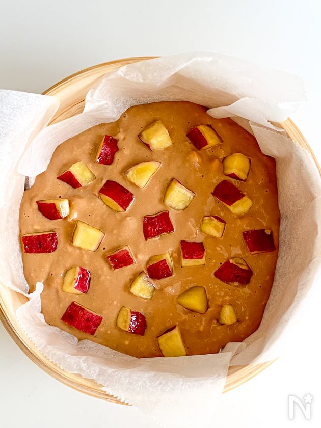 (5) せいろに生地を流し、さつまいも(残り)をトッピングして、蒸気の上がった鍋にのせて強火で15~18分加熱する。