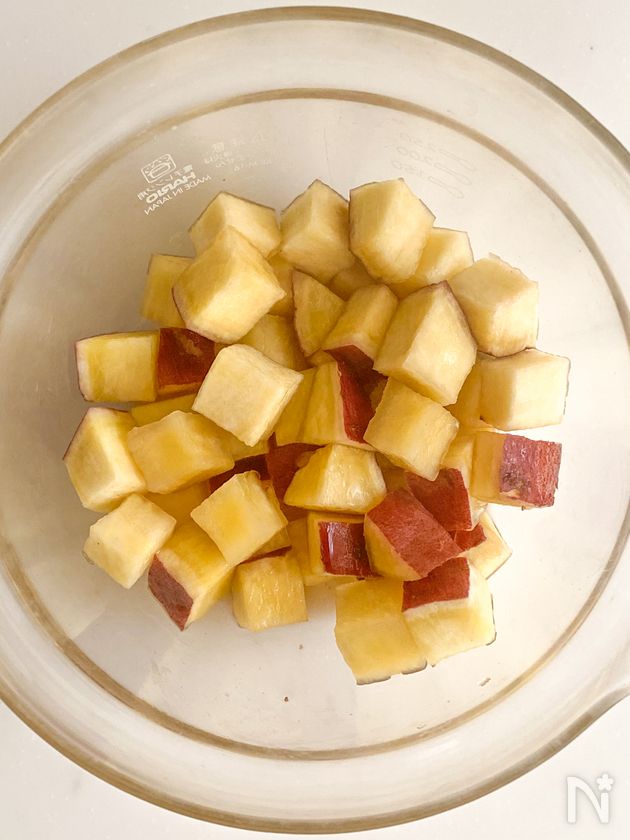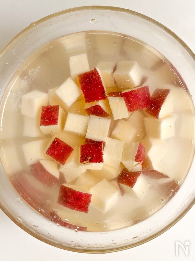 (1) さつまいもは皮ごとよく洗い、1cm角に切って水にさらす。