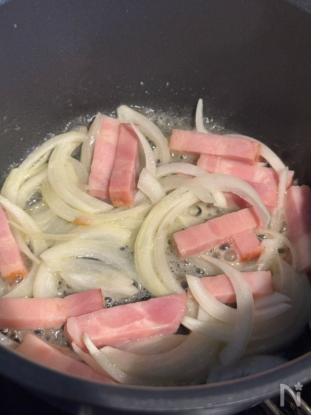 (2) 鍋にバターを入れて溶かし、厚切りベーコンと薄切りにした玉ねぎを入れて炒める。