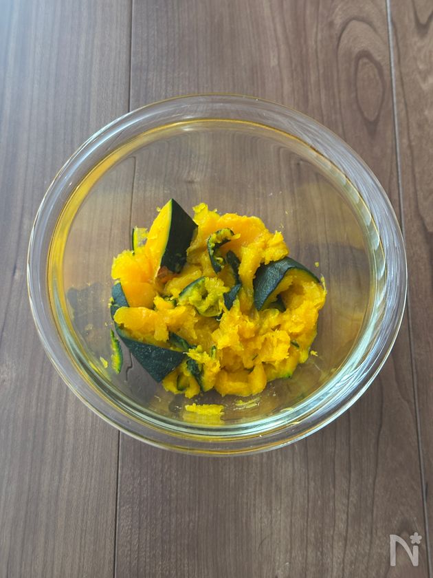 (1) かぼちゃは一口大に切って耐熱ボウルに入れ、水(分量外)小さじ1をまわしかけてラップをして600wで約5分加熱する。