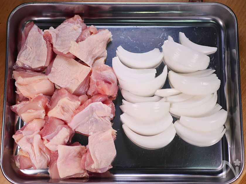 ○玉ねぎは厚さ1㎝のくし形切りにする。