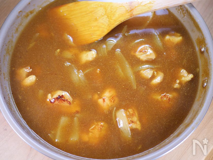 (4) 混ぜ合わせた【B】を加え、とろみがつくまで木べらで混ぜ続け、フタをしないでさらに5分グツグツと煮込む。