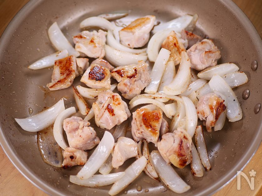 (1) ○鶏もも肉は余分な皮と脂を取り除き、小さめの一口大に切り、塩ひとつまみ(分量外)を振る。