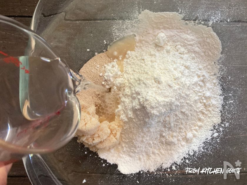 【A】を上から順番に測って入れ、最後にぬるま湯をイーストめがけて入れる。粉っぽさがなくなるまで混ぜる。