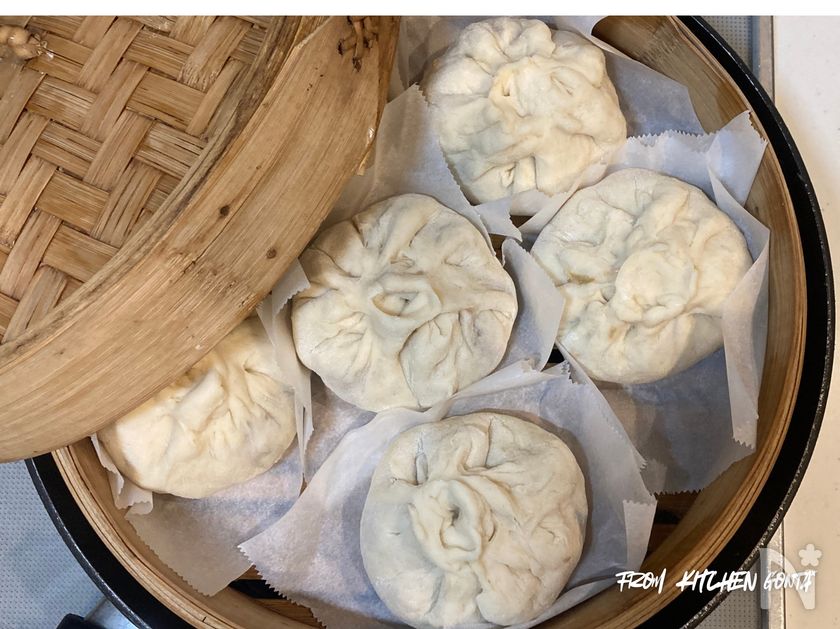 (8) 包み終わった豚まんを、10cm角のクッキングシートに乗せ、中火で蒸す。