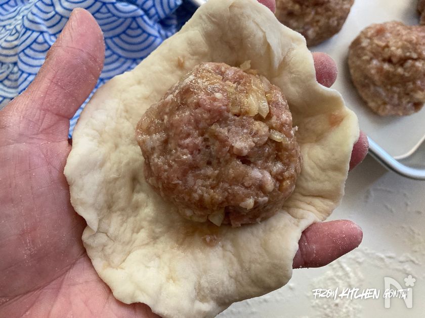 (7) 生地に打ち粉をし、直径12cmに広げ、ヒダを作りながら具材を包む。
