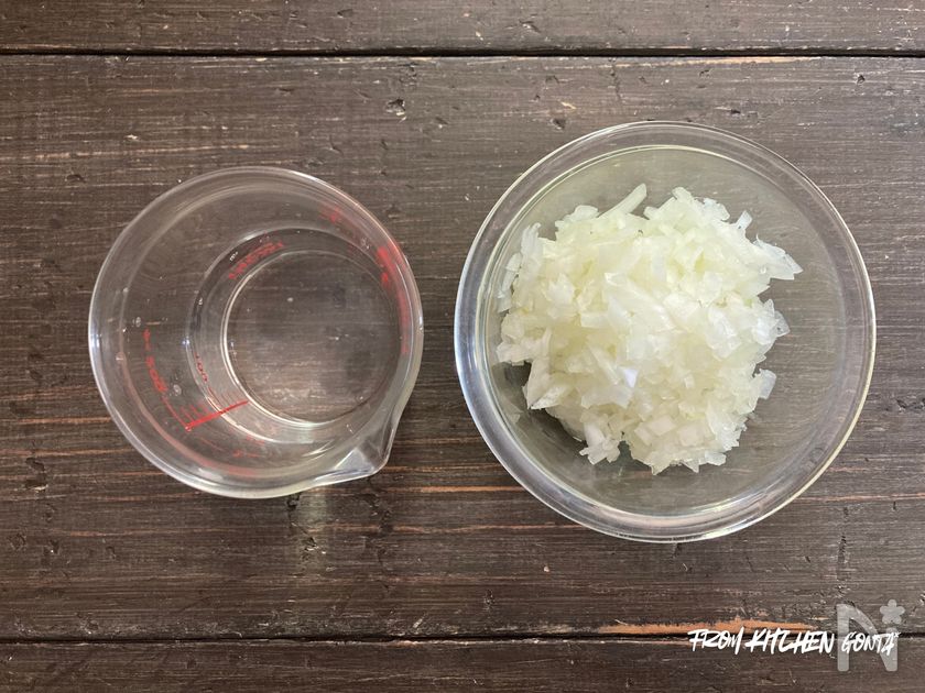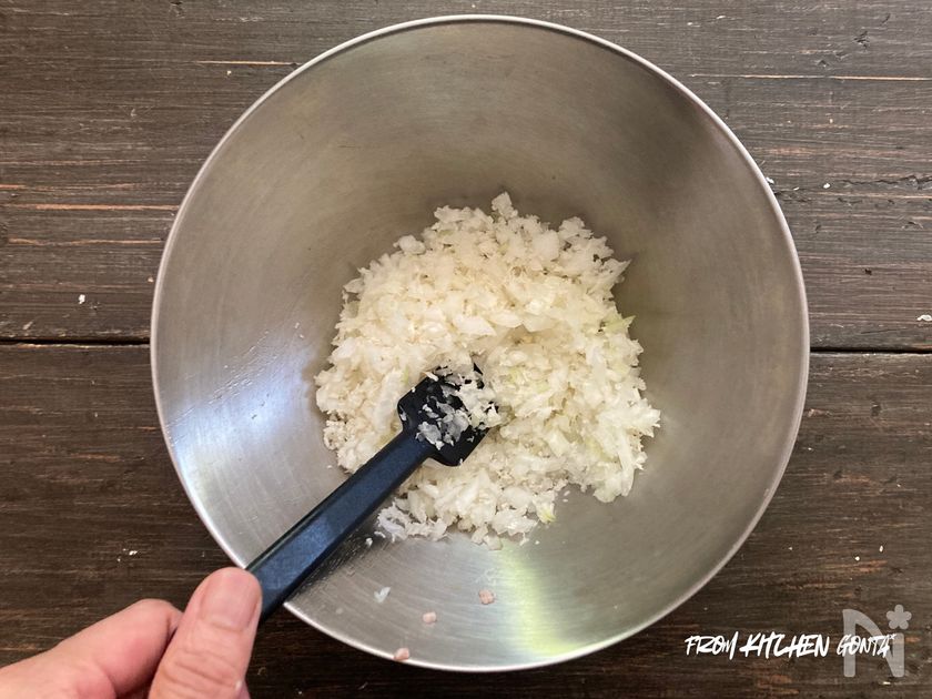 みじん切りの玉ねぎとパン粉を一緒に混ぜ、水分を吸わせる。
