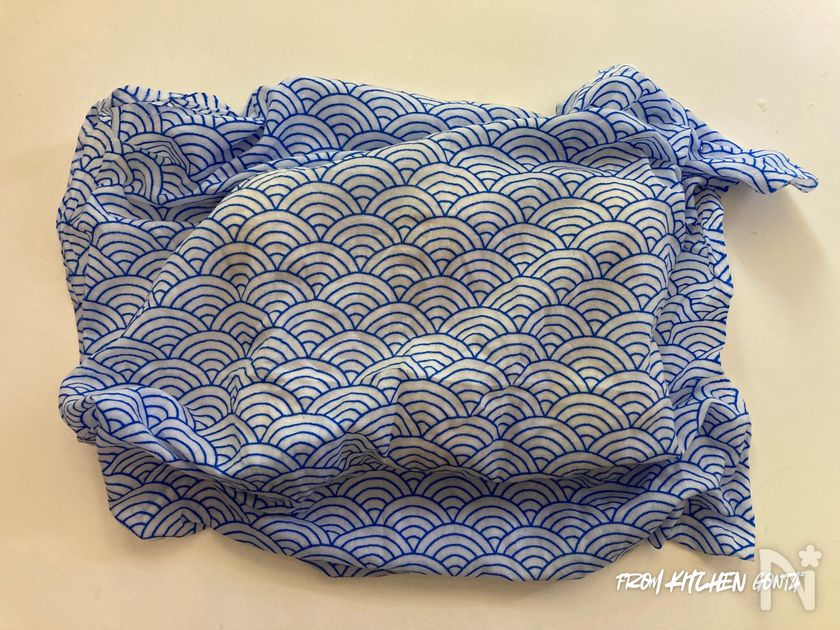 (6) 発酵の終わった皮生地を、6等分にする。乾燥を防ぐために、濡布巾をかけておく。