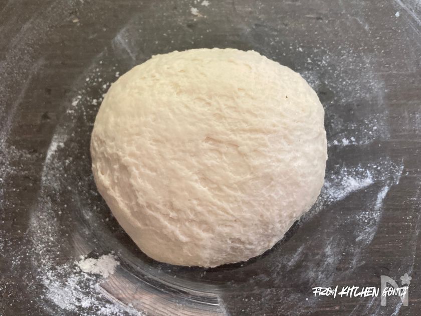 (2) 混ぜにくくなって塊になってきたら、台の上に取り出し、約5分ほど捏ねる。捏ね上がり後は、40度前後で、30 分一次発酵させる。