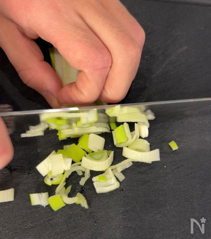 (4) 塩を振ってひと混ぜしたら、器に盛り付けて、小ネギを散らす。