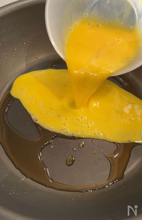 (1) フライパンにごま油をひき、強火にかけて、溶いた卵を入れる。