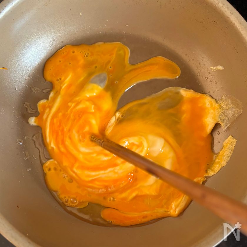 (3) 同じボウルに卵を入れ、大きめの炒り卵にする。
